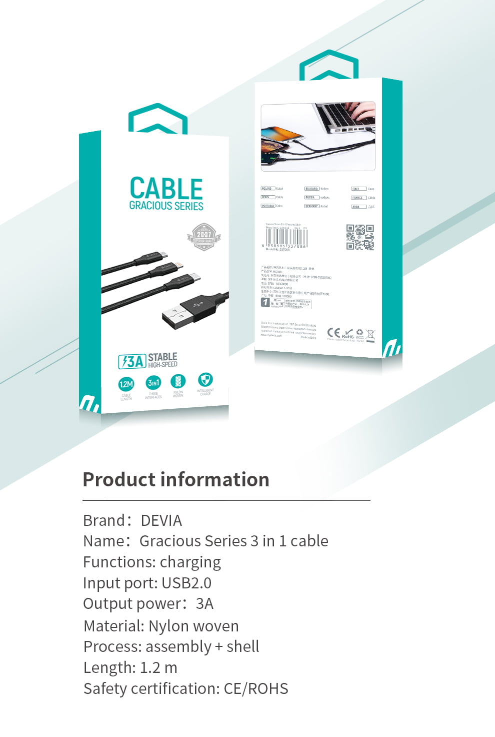 Engineered with premium materials and cutting-edge technology, our 3-in-1 cable ensures fast and efficient data transfer and charging for your smartphones, tablets, and other devices. Say goodbye to the hassle of carrying multiple cables and embrace the convenience of a single, sleek solution.