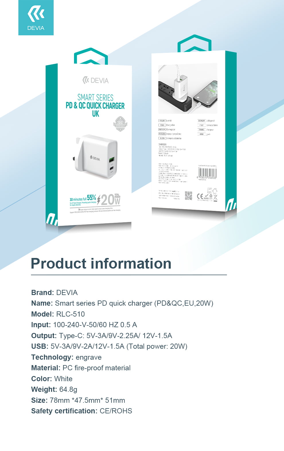 The Devia Smart Series PD & QC Fast Charger 20W USB is a wall charger that allows optimally fast & safe charging. The USB-C can fast charge phone from 5-55% in 30 minutes thereby enabling you to spend less time charging. It is a compatible and universal charger.